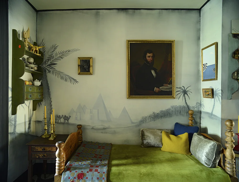 HAND PANTED CASEIN EN GRISAILLE MURAL OF LUXOR, EGYPT. NYC